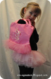 A few years ago a friend of mine was telling me about a bag she saw at one of her daughter Maya's ballet classes and after describing it to me she asked if I thought I could make it. I thought sure, I wish I had been able to look at the bag in person to get a better idea of what I would be making but she told me it was a bag that essentially looked like a little ballerina leotard with a tutu. With that description I set out to make a bag for Maya that looked like the one they had seen. My first attempt, I thought was very successful and it was wrapped up and delivered to cute little Maya for her birthday, never to be thought of again. Fast forward to last week when I was cleaning/organizing my stash and I came across 2 extra outer pieces I had cut for the bag and I remembered oh, that was a cute bag, I should make another one and blog about it so that is what I am doing.