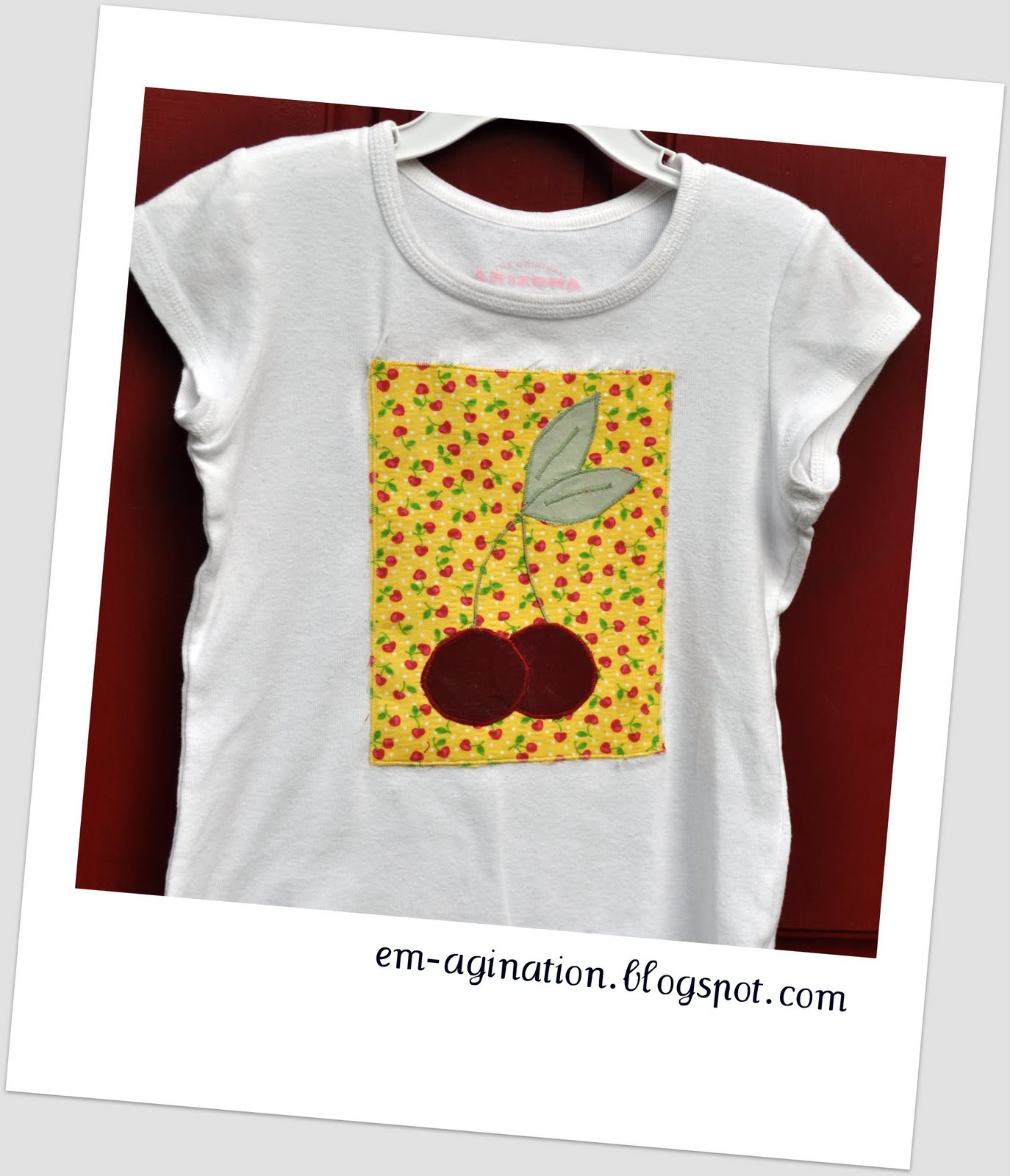 For the shirt, I used an existing plain white t-shirt in my daughter's closet that had a stain on the front. I cut out a rectangle of cute cherry fabric that I had left over from a skirt I made her a few years ago and appliqued on a couple of large cherries, that I free hand cut out of scraps. I then took the entire rectangle and appliqued it right over the stains on the t-shirt, good as new and pretty darn cute. The only complaint I have is, I wish I had remembered to back the shirt with a little bit of stabilizer because as I was sewing the applique onto the t-shirt, the fabric of the t-shirt pulled quite a bit and caused it to pucker quite a bit. Oh well lesson learned, at least I didn't learn this lesson on a new shirt.